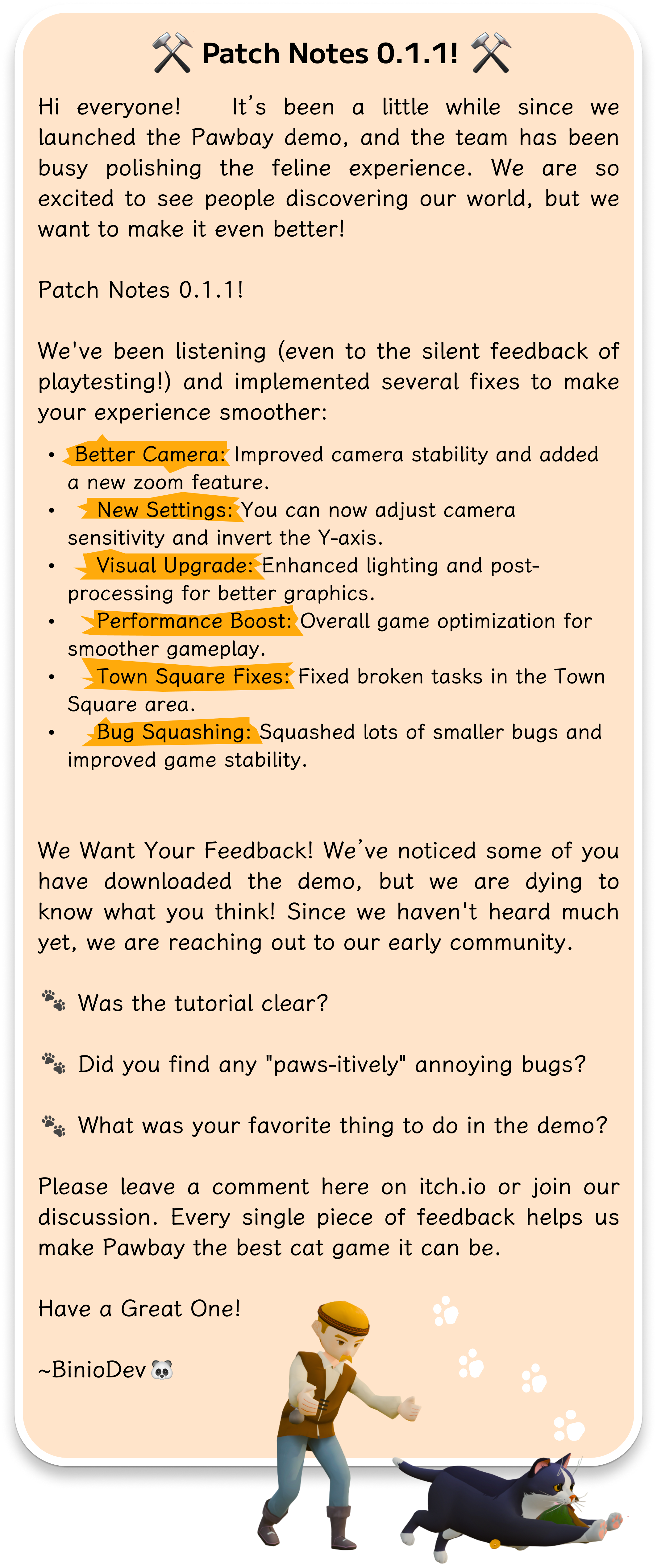 Take part in the most coziest cat adventure! Explore a lively town through the eyes of a mischievous cat.